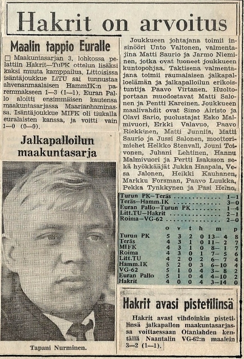 HERMANNIN PALLO (HePa): puh.joht. Kauko Ruoho, sihteeri Aimo Ihander, valmentajat: Kauko Ruoho ja Jorma Kärkkäinen ~ paita keltainen, housut mustat.