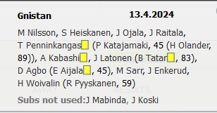 Vaihtoon: Joakim Latonen, Luca Weckström, Medo ja Maximo Tolonen * Vaihdosta: Zachary Sukunda, Kasper Liikonen, Eero Markkanen ja Robbie Malolo.