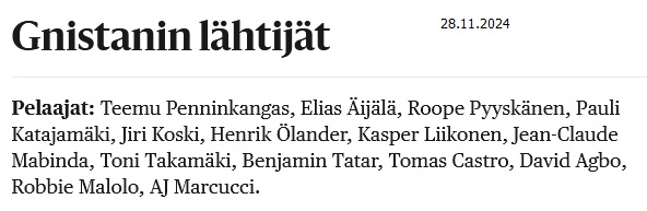 Vaihtoon: Jean-Claude Mabinda, Luca Weckström ja Aasro Tiihonen * Vaihdosta: Maximo Tolonen, Kasper Liikonen ja Eero Markkanen.