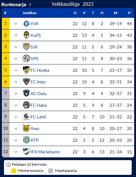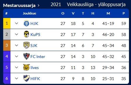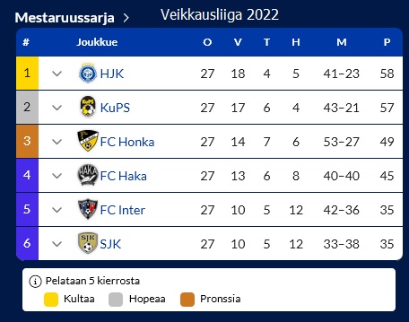 HJK runkosarjan jälkeen toisena - yhden pisteen KuPS:n jäljessä - ja neljä pistettä Ilveksen edellä.