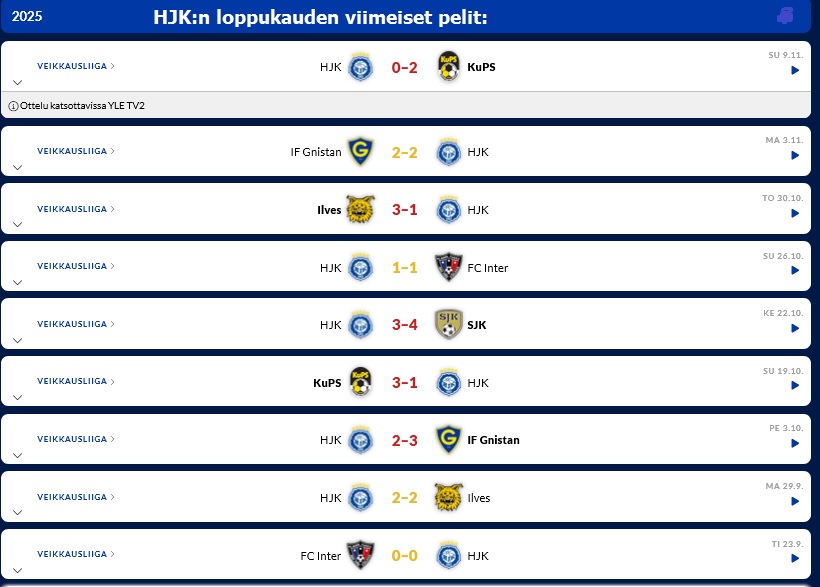 (22.4.2025 * Veikkausliigan 3. kierros): HJK - Gnistan 0-1 * tappio merkitsi HJK:lle historiansa pisintä tappioputkea.