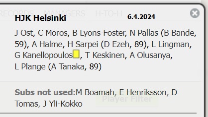 Maali: vastustajan omamaali * vaihtoon: Lingman, Toivonen, Keskinen ja Möller - ulosajo: Moros Garcia * vaihdosta: Atom, Ezeh, Vaher ja Nunoo Sarpei.