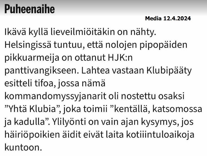 (6.4.2024 * Velja Engström * Ruutu-TV.n selostaja KuPS-HJK-ottelun 80. minuutin paikkeilla): HJK:n kannattajat tekevät itsestään taas totaalisia pellejä - idioottimaista käytöstä..