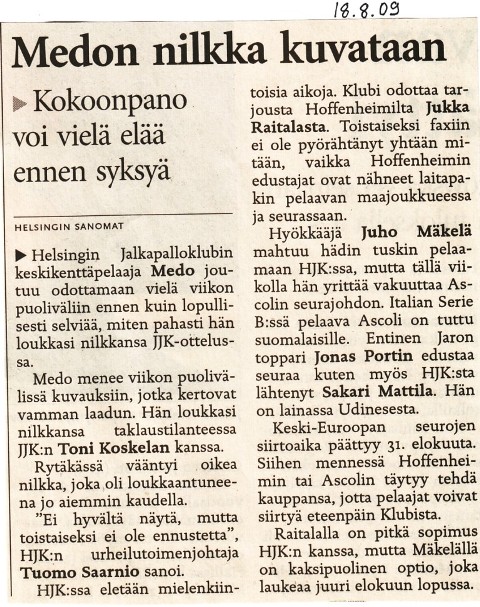 (HJK * 18.8.2019): (mv) Maksim Rudakov, Henri Toivomäki (Rafinha), Daniel O'Shaugnessy, Faith Friday Obilor, Viktor Luiz (Eetu Vertainen), Sebastian Dahlstöm, Evans Mensah. Santeri Väänänen, Petteri Forsell, Sekou Camara (Tim Väyrynen) ja Riku Riski. Vaihdossa: (mv) Markus Uusitalo, Erfan Zeneli, William Parra Sinistera ja Roni Peiponen. Maali: Väyrynen. Päävalmentaja: Toni Koskela.
