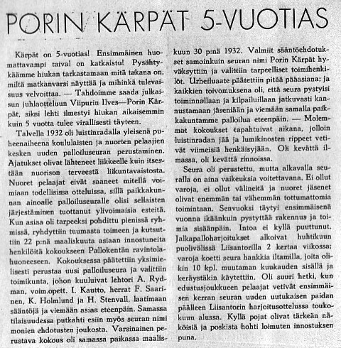 Porin Kärpät voitti vuonna 1948 Suomen Palloliiton (SPL) nuorten jalkapallomestaruuden. Sen jälkeen seura useana vuonna oli ko. liiton poikien toimintakilpailun ykkönen. Siitä seurasi, että SPL lähetti kesäkuussa 1951 Kärppien 16-vuotiaiden poikien joukkueen Suomen edustajaksi kööpenhaminalaisen KB:n suureen juhlaturnaukseen. Menestys oli kohtuullinen kaksi vuotta vanhempien kilpakumppaneiden sarjassa. Paluumatkalla pojat ottelivat Malmössa Malmö IF.n samanikäisten kanssa tasapäisesti sekä Tukholmassa erään miesjoukkueen kanssa. Viidessä kansainvälisessä ottelussa oli mukana 10 Porin Lyseon oppilasta . Matka ja sen tuoma arvonanto lisäsivät merkittävästi satakuntalaista jalkapalloinnostusta.
