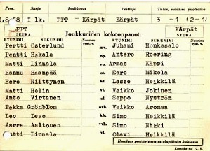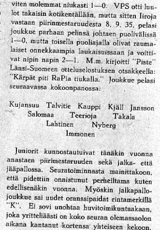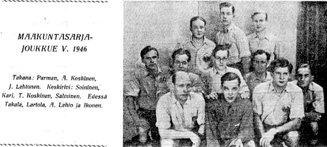 Ylärivi vasemmalta: huoltaja V Ismosalo , O Käppi, P Nordlund ,J Kujala, K Brander, E Mikola, J Kreula, E Harell, O Heikkilä, Pukupäällä O Sillanpää. Edessä vas. R Kari, J Saarinen ja A Jokinen. Kaikilla oli myös ns. kutsumanimi, varmaan käytössä kun tapasivat.