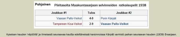 (Jukka Joutsi, 15.4.2014): Porin Kärpät voitti siis Suomen Palloliiton (SPL) mestaruuden. Virallinen nuorten Suomen mestaruus ratkaistiin varmaankin perinteisesti tuon ajan käytännöllä eli SPL:n Nuorten mestari kohtasi TUL:n mestarin. Kyseisestä ottelusta ei kirjoitushetkellä ole löytynyt faktatietoa, mutta eräät muistelijat arvelivat Kärppien kohdanneen Kotkan Työväen Palloilijat (TUL) ja hävinneen. SPL:n julkaisemat vuotuiset Jalkapallokirjat eivät ajan poliititsen jännitteen vuoksi maininneet sanaakaan TUL-toiminnasta, joten siksi tuosta mahdollisesta virallisesta SM-ottelusta ei ole tietoa ollut löydettävissä. Kaudella 1948 KTP voitti ko. liittofinaalissa Suomen mestaruuden voittamalla SPL-mestari VPS:n 1-0.