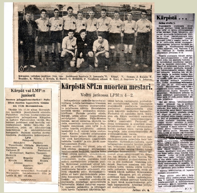 Markku Harell lähetti (14.4.2014) nämä lehtileikkeet A-nuorten SM-finaalista Kärpät-LPM 4-2. Lehtijutut ovat peräisin lähettäjän serkun Erkki Harellin aikoinaan keräämästä arkistosta.
