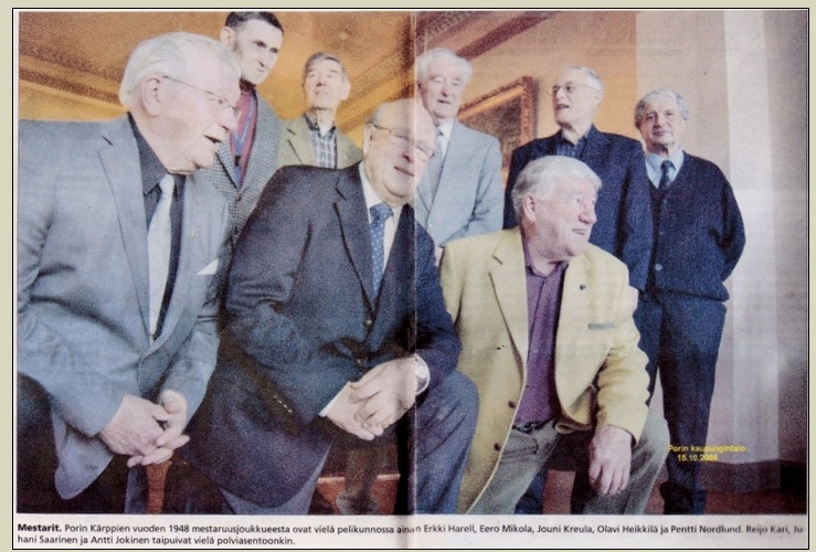 Markku Harell (14.4.2014): Ja sitten viimeinen n. 60 vuotta mestaruudesta. Aika kulkee vääjäämättömästi: 15.10 2008 paikalle saapui kahdeksan vuonna 1948 mestaruuden voittanutta pelaajaa .Kuva on otettu vierailulta Porin kaupungintalolla, joka kuului päivän ohjelmaan. Eturivi vas. Reijo Kari, Juhani Saarinen, Antti Jokinen. Takarivi vas. Erkki "Nyskä" Harell, Eero Mikola, Jouni Kreula, Olavi Heikkilä ja Pentti Nordlund.
