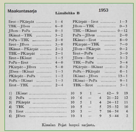 Markku Harell (14.4.2014): Kun edellä mainitusta finaaliottelusta oli kulunut 50 vuotta, paikalle olivat vielä "laukaisukunnossa" saapuneet kuvattavaksi seuraavat pelaajat (kuva on otettu 15 syyskuuta 1998): 1. R Kari 2. J Saarinen 3. A Jokinen 4. A Uusivuori (toimi ns.valmentajana) 5. O Käppi 6. E Mikola 7. K Brander 8. E Harell 9. O Heikkilä ja 10. P Nordlund.