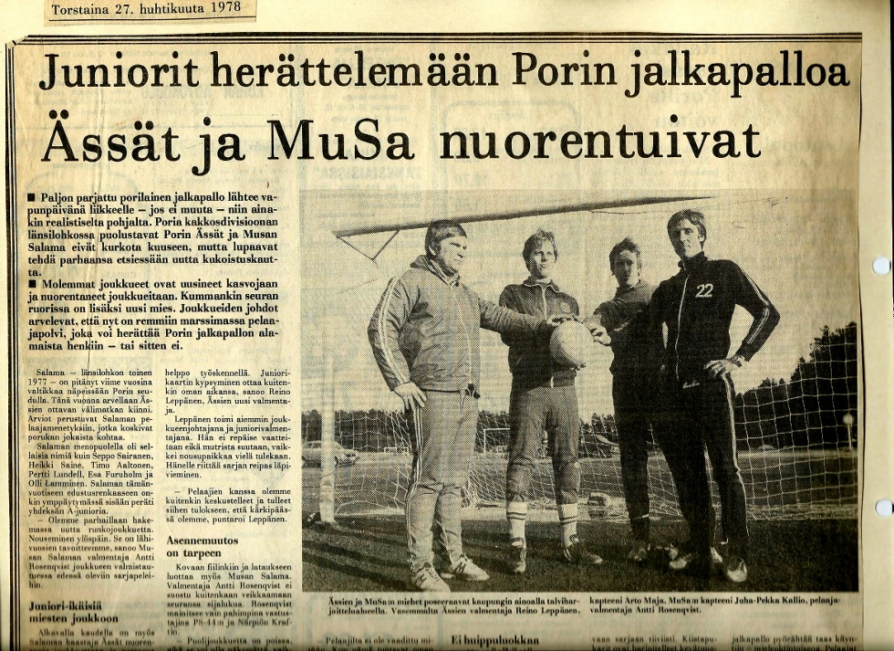 Ensimmäiselle pelikaudelleen 1960 Musan Salama laittoi edustusjoukkueen piirisarjaan ja myös C-juniorien joukkueen ikäistensä piirisarjaan. Kaikkien yllätykseksi MuSa:n C-juniorit voittivat heti piirinmestaruuden Ismo Ståhlströmin valmennuksessa. Joukkueen pelaajia olivat (mv) Esa Vironen, Alpo Kallio, Jouko Salo, Pekka Hammais, Jukka Willman, Heikki Kynäslahti, Uolevi Saarinen, Olli Niinikoski, Seppo Vironen, Juhani Perkiömäki ja Jouko Hurme. Maalivahti Esa Vironen pelasi myöhemmin - 1968-69 - Porin Ässien SM-sarjajoukkueen maalivahtina (lähdeteos: MuSa-kirja * 2022 , Pekka Ruissalo).
