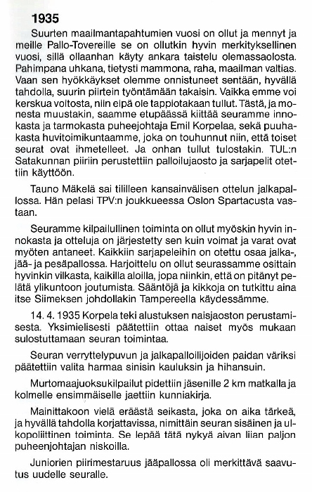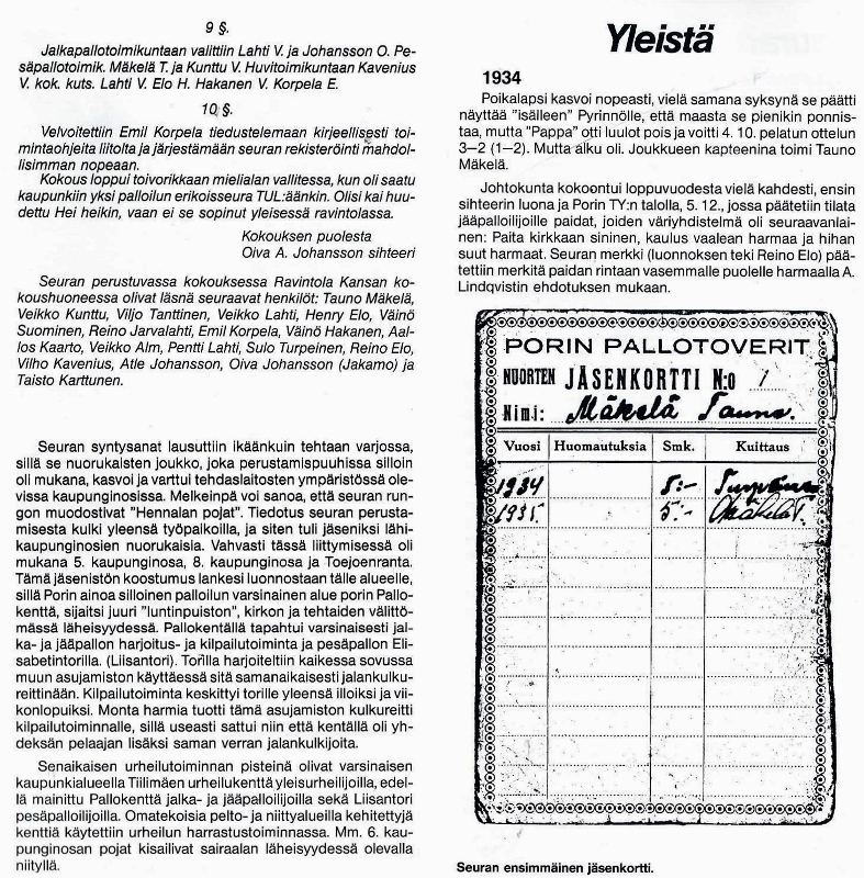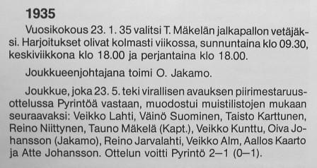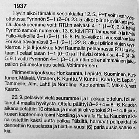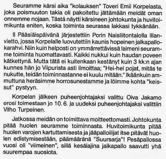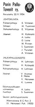 Seuran puheenjohtaja oli tuolloin Eero Virtanen. Johtokunnan jäsenistä erottuvat Heikki Kylänpää ja edustusjoukkueen valmentaja ja pelaaja Antero "Setori" Laiho.