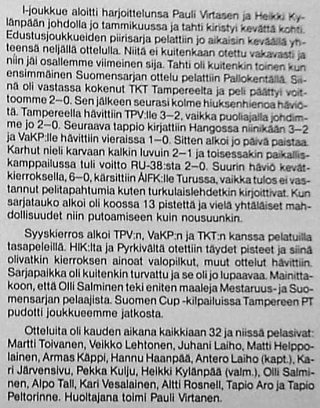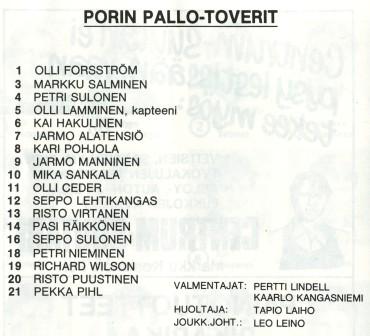 Martti Toivanen, Seppo Mäkinen, Kari Lumme, Kalle Virtanen, Matti Helppolainen, Esa Malmberg, Pasi Aarnio, Pauli Rosenberg, Heimo Järvenpää, Kari Järvensivu, Jukka Koskinen, Veikko Aromaa, Esa Hulpio, Alpo Tall, Tapio Aro ja Jorma Murto (yhden pelaajan nimi sivulta jäi epäselväksi).