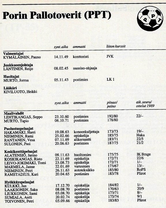 PPT:n miehistöon kuuluivat TuTo-karsintaottelussa: mv. Martti Toivanen, Matti Helppolainen, Pasi Aarnio, Kari Järvensivu, Antero Laiho, Esa Malmberg, Jukka Koskinen, Heikki Salminen, Tapio Aro, Alpo Tall ja Esa Hulpio.