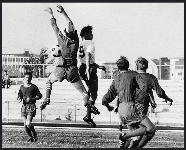 Tämä kuva on 2. divisioonan länsilohkon ottelusta IFFK-PPT 0-0 (lauantai 18.7.1970 - kuva: Joutsi) Ahvenanmaalla, Finströmin nurmikentällä. Punapaitainen joukkue kuvassa on kotijoukkue IFFK, porilaisvieraat pelasivat kakkosasussaan keltaisissa paidoissa ja sinisissä housuissa.