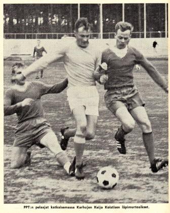 Karsintapelin varsinainen peliaika päättyi 0-0, myös jatkoaika päättyi 0-0. Toinen jatkoaika oli tasaista aivan sen viimeisille minuuteille asti, kunnes PPT:n omalla rangaistusalueella tuomari Taisto Enckell näki porilaisen pelaajan käsivirheen ja osoitti kylmästi pilkkua. Tuomitun rangaistuspotkun ampui maaliin Juha Söderman.