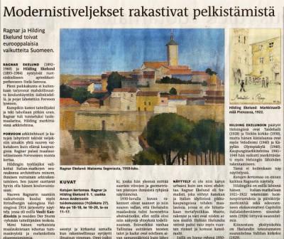 Ragnar Ekelundin 'Laredo'-maalaus on tämän kirjoittajan suosikkityö varsinkin Ragnarin Kangasniemen ulkopuolella maalaamista teoksista. Ragnar saattoi viettää ulkomaanmatkoillaan tuntikausia yksittäisten rakennuksien seiniä tutkien - hän teki paikanpäällä millimetrin tarkkoja muistiinpanotutkimuksia näköhavaintoihinsa perustuen siitä, miten sama seinän väri luonnossa vaihtui useisiin eri sävyihin pienelläkin alueella. Arkkitehtiveli Hilding saattoi myös viettää pitkiä aikoja seiniä tuijotellen, häntä puolestaan kiinnosti seinätilan ja ikkunoiden suhde toisiinsa. Hänen tutkimuksensa kiteytyivät lopulta pelkistettyyn todellisuuteen pohjautuvaan syvälliseen, mutta kadehdittavan yksinkertaiseen oivallukseen: Ikkuna on aukko seinässä.