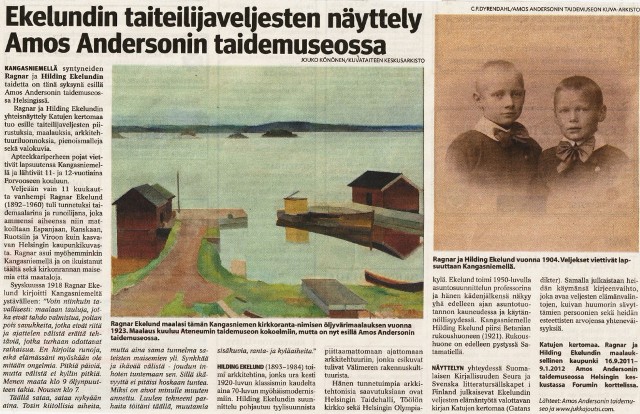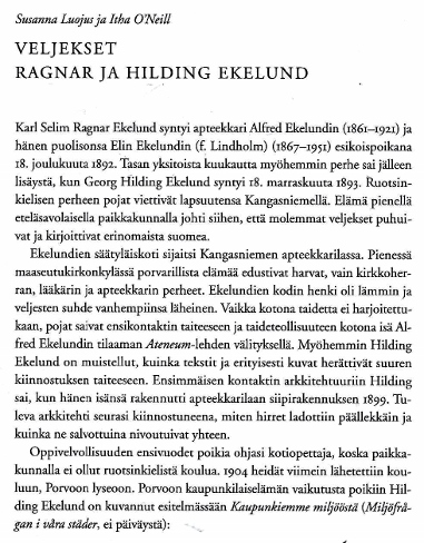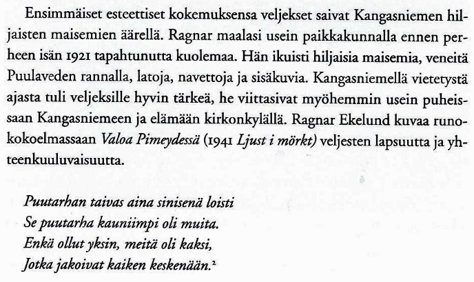 Ragnar ja Hilding Ekelundin lapsuusvuosia Kangasniemellä ennen Porvooseen kouluun lähtöä v. 1904 kuvattuna kirjassa Katujen kertomaa (Luojus, O'Neill * SKS-2011).