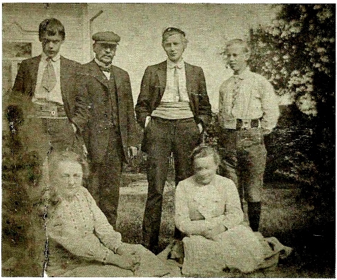 Ekelundin perhe Kangasniemen apteekkarilassa. Vasemmalta takana Hilding, isä Alfred, Ragnar ja mahdollisesti Erik Ekelund. Eturivissä istumassa vasemmalla äiti Elin, oikealla tunnistamatta jäänyt neitokainen. Rgnarin päässä on kuvassa ylioppilaslakki. Hän kirjoitti ylioppilaaksi Porvoon lyseosta keväällä 1911. Kuva kirjasta Katujen kertomaa (Luojus, O'Neill * SKS-2011).