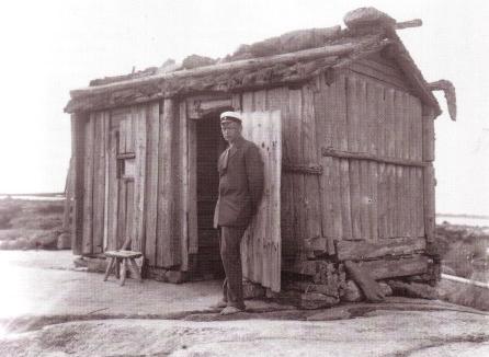 Arkkitehtiopiskelija Hilding Ekelund kuvattuna v.1914 tutkimusmatkallaan Etelä-Pohjanmaalla, missä hänen innostuksenaan oli piirtää talteen alueen vanhoja kansanomaisia hirsirakennuksia.