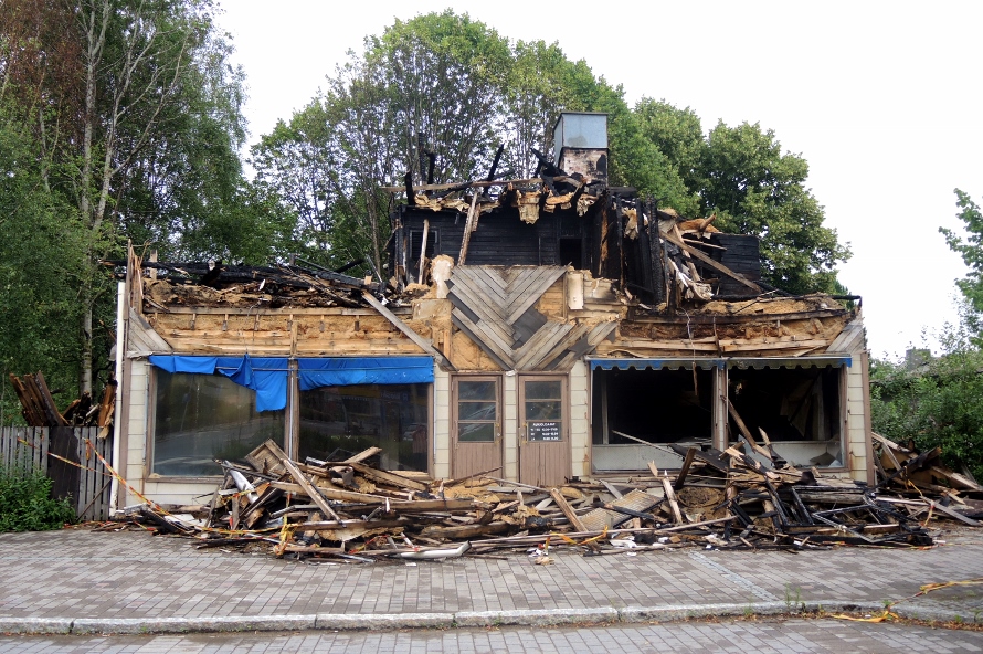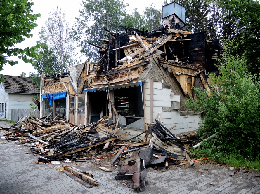 Autioitunut liike- ja asuinrakennus palanut aivan Lammin keskustassa Matkahuoltoa ja R-kioskia vastapäätä. Kuvattu 3.7.2016 (S&J).
