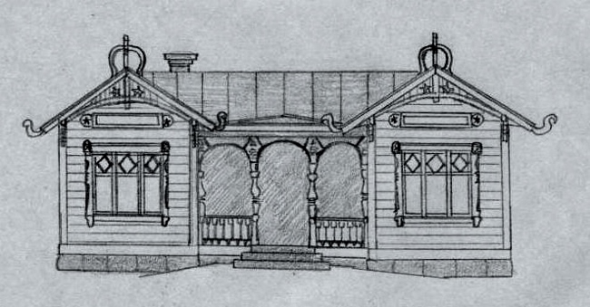 Mika Vähä-Lassilan piirros Santalan alkuperäisestä asemarakennuksesta, joka tuhoutui sotatoimissa 1941. Käyttölupa "2015-11-A", kiitos.