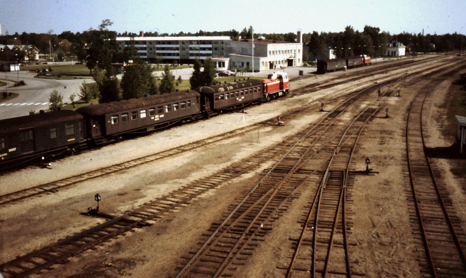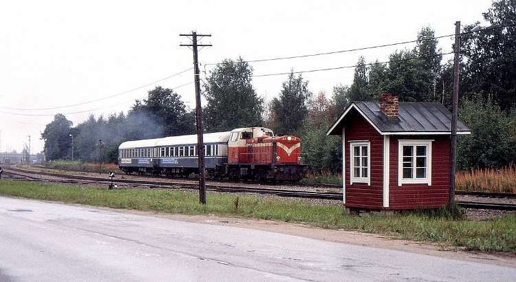 Pauli Ruonala kuvasi Hanko-Pohjoisella 17.8.1988: "Hangosta lähtevä juna pysähtyy kohta Hanko-Pohjoisessa. Normaalisti junassa on edelleen kaksi matkustajavaunua, mutta puuvaunuista on luovuttu. Kuvassa myös Hanko-Pohjoisen vaihdekoppi." Käyttölupa "2017-1-C", kiitos.
