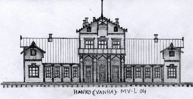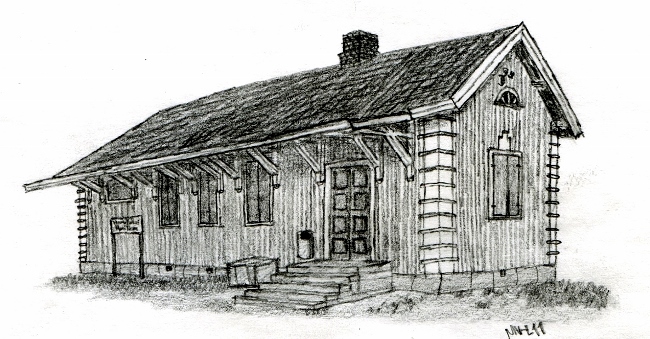 Mika Vähä-Lassilan piirros Hanko-Pohjoisen asemarakennuksesta, joka paloi vuonna 2011. Käyttölupa "2015-11-A", kiitos.