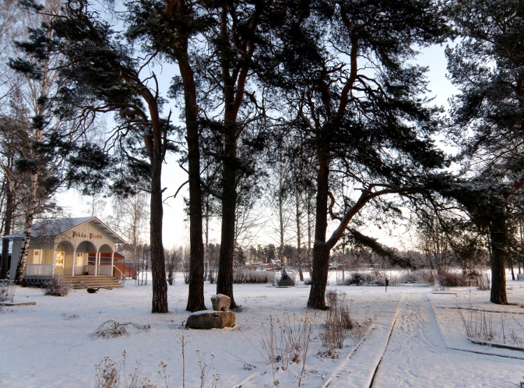 Puretun Pirtin paikka käy ilmi tästä kuvasta (otettu 19.1.2014 - S&J) - Pirtin sisäänkäynti oli neljän männyn muodostaman ryhmän takana olevalla aukolla näkyvästä muistomerkistä noin viisi metriä (kuvassa) oikealle. Kuvassa vasemmalle talkooryhmän ideoima 'Pikku-Pirtti'- esiintymislava esikuvansa muistoksi ja kunniaksi .