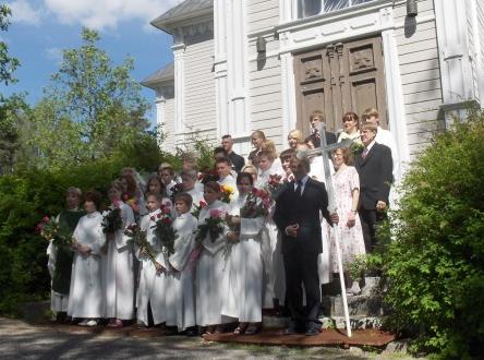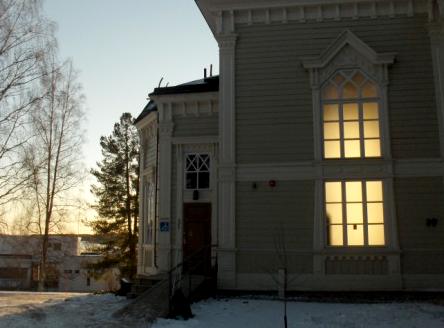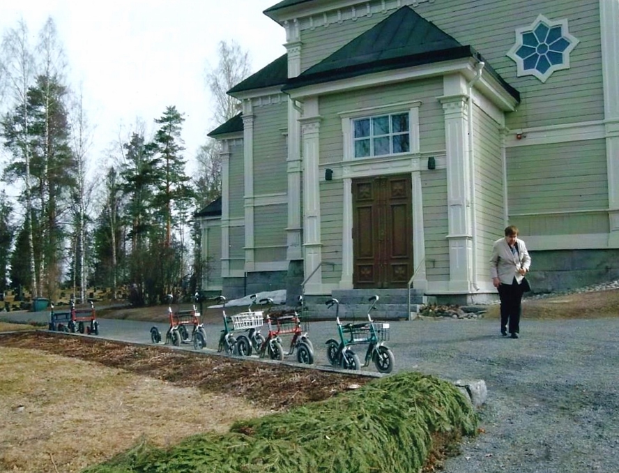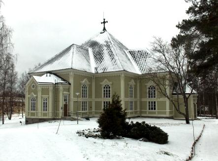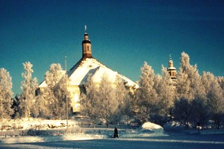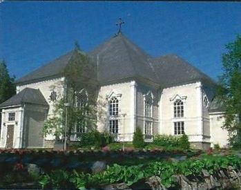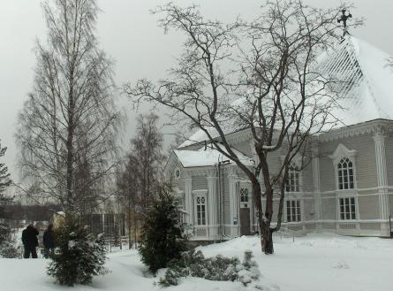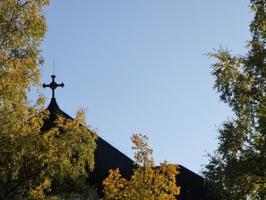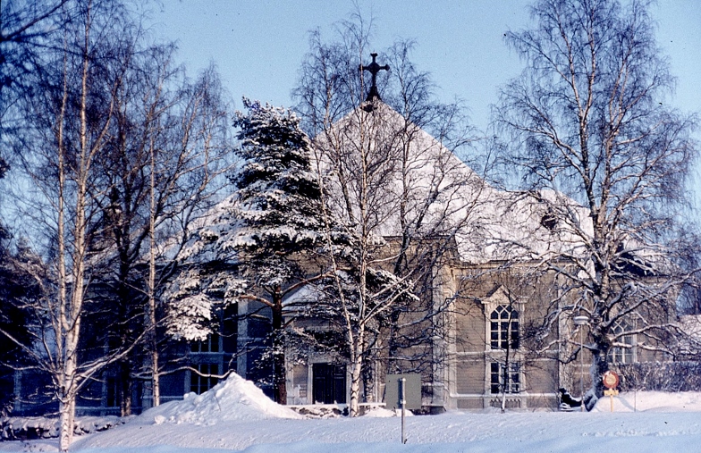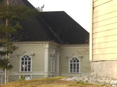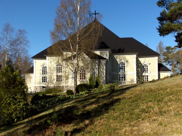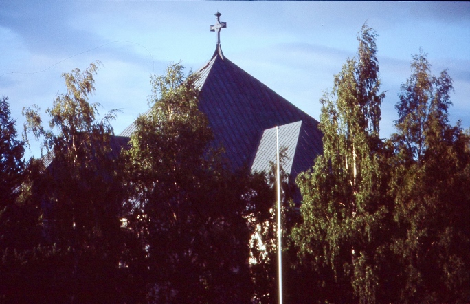 Kirkko seurakuntatalon suunnalta - vuorenkilvet hallitsevat näkymää  - 12.5.2009 (S&J).