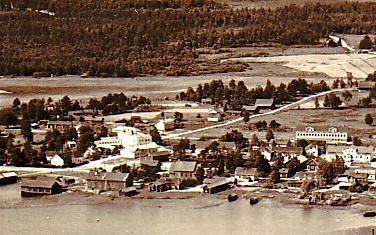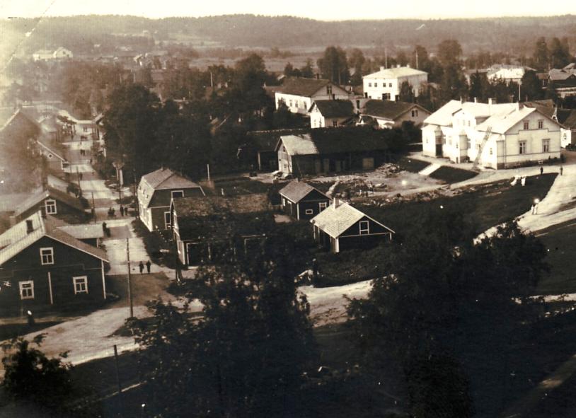 Tämä tapulinäkymä on kuvattu v.1943. Varjojen suunnista päätellen on varhainen aamu. 'Matkustajakodin' takaa piirtyy näkyviin Vilho Laitisen vaalea rakennus, jonka kattoon on tehty edellisen kuvan jälkeen remonttia.