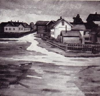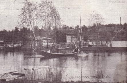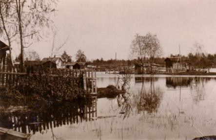 Vesi on peittänyt laajalti enemmän alueita Satamatien itäpuolella. Pirtti ja Penttisen majatalo näkyvät vasemmalla ja sieltä johti kapea siltakannas kuvasta vasemmalle sijainneeseen pieneen saarekkeeseen, missä oli Sanni Seppäsen mökki.