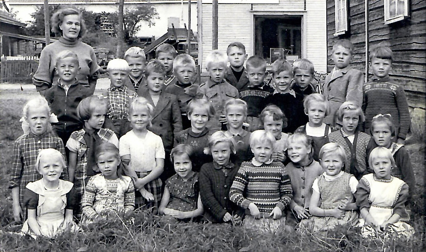 Toinen rivi vasemmalta: Lehkosen velikullat, joista vasemmanpuoleinen oli toisella luokalla ja Markku ekalla, Erkki Seppänen, Markku Saloranta, Katriina Kärkkäinen, Pirkko Jurvanen, tuntematon, Pirkko (?) Heinonen ja Eila Lahikainen.