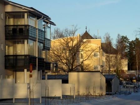 Rukoushuone Betania' ja valmistunut uusi kerrostalo Otonpuisto yhdessä - eri suunnasta. Kuvattu 22.8.2008 (S&J).