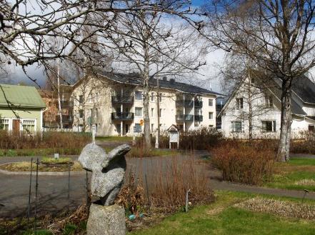Etualalla Juhani Saksan Lentoon-niminen kivipöllöpatsas Pirtinpuistossa.