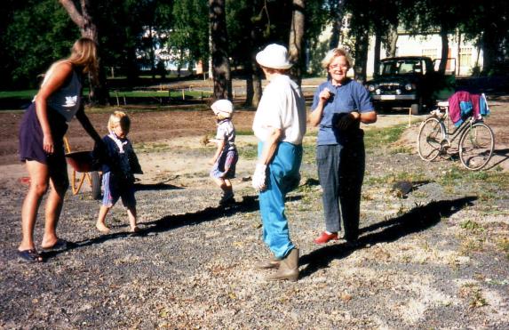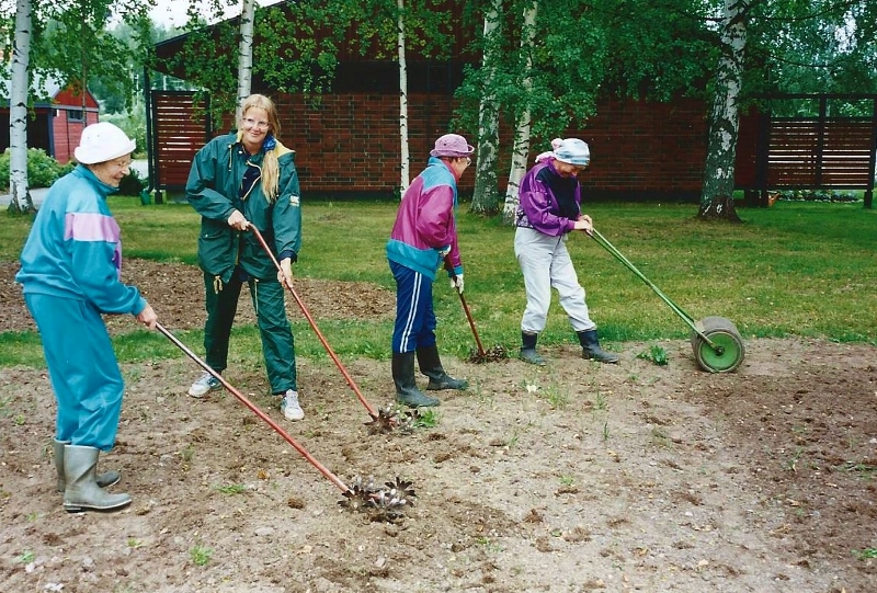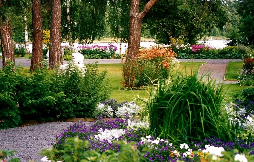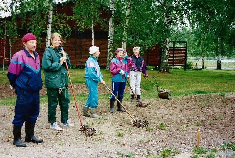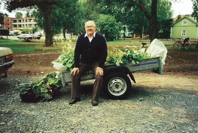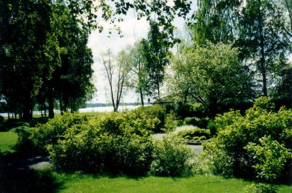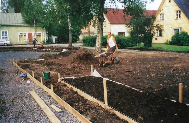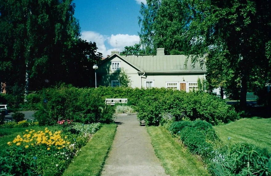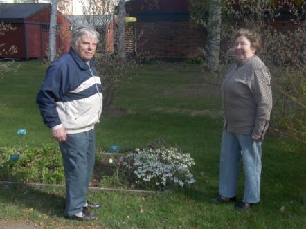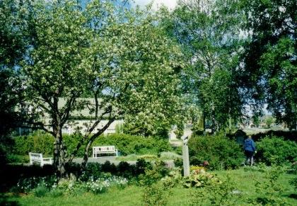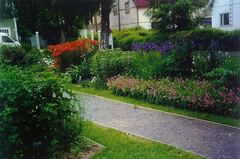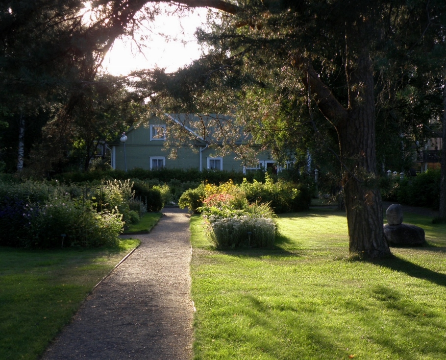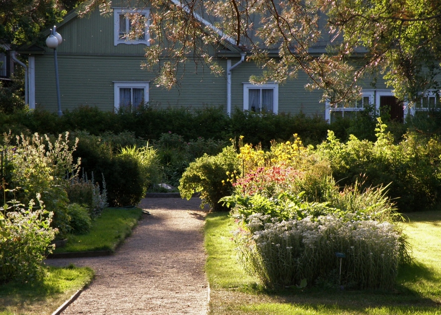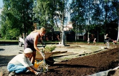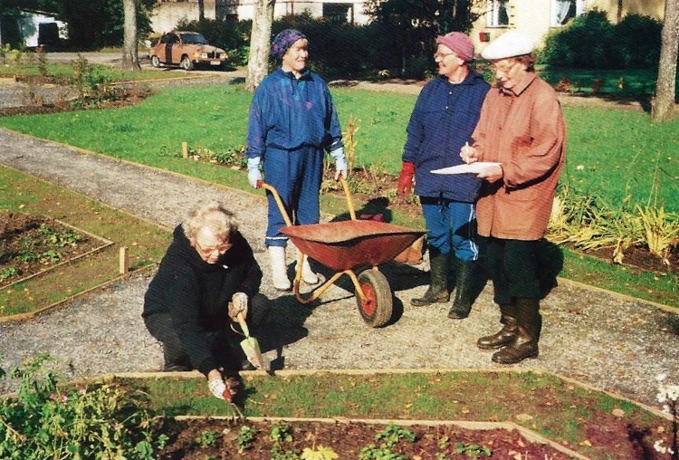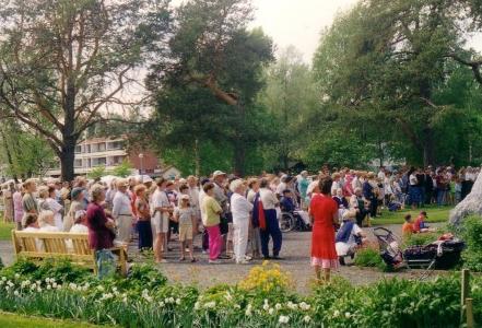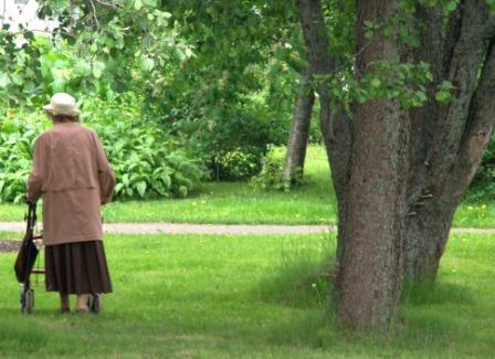 Kaija Suuronen poistumassa Hiskin muistomerkin paljastamistilaisuudesta sunnuntaina 14.6.2009 (S&J) hänelle tuttua Pirtinpuiston perinnekasvipuistoa kohti.