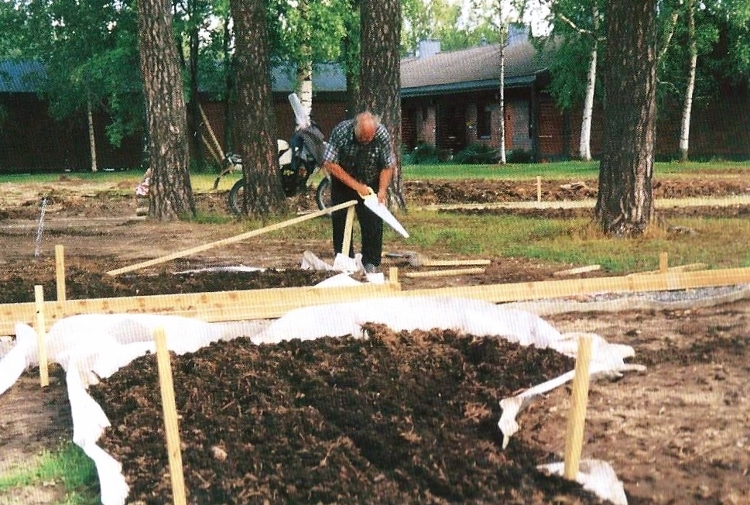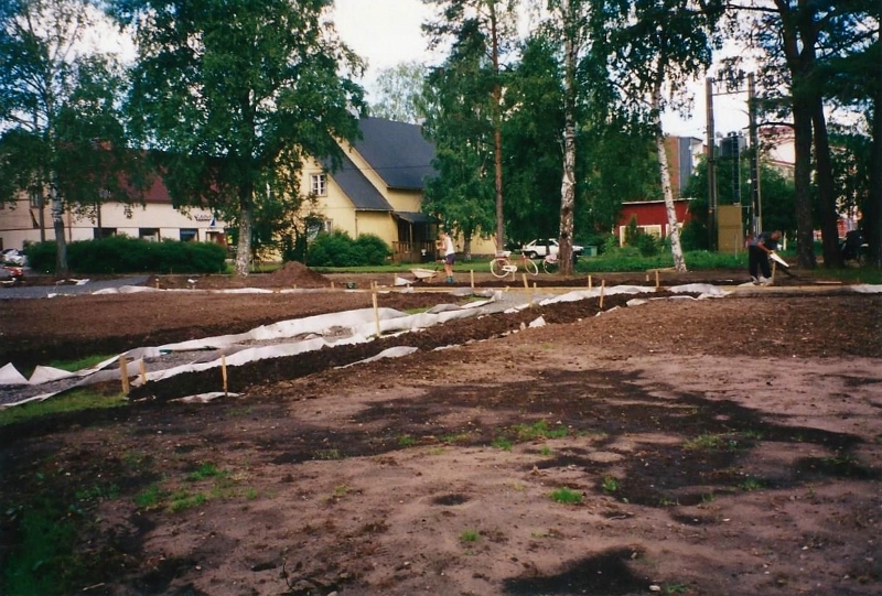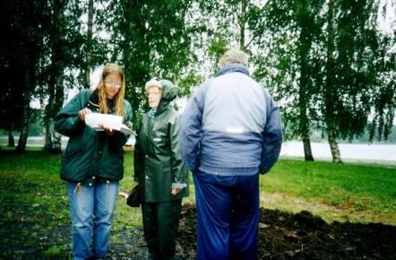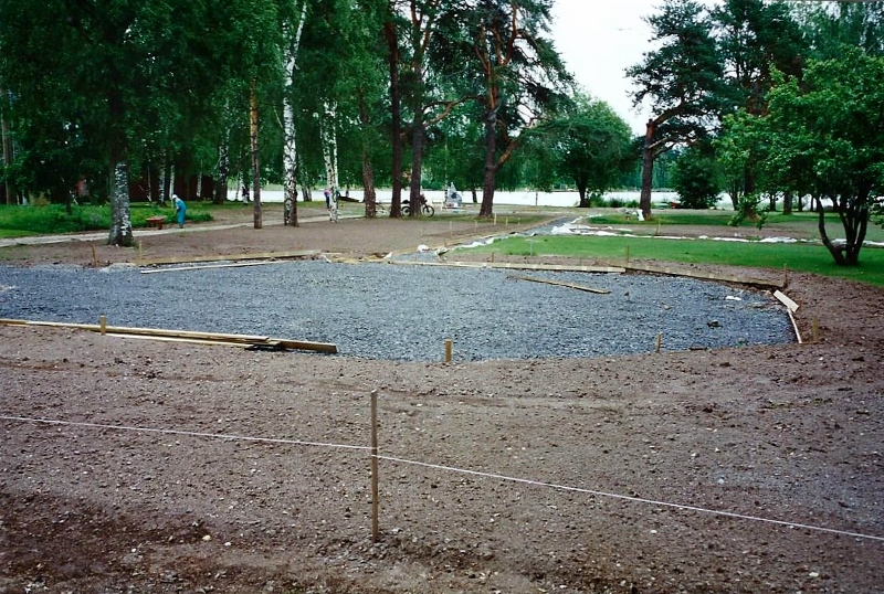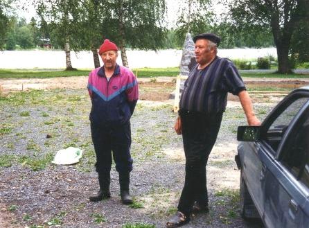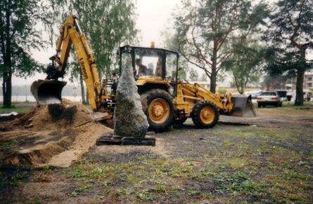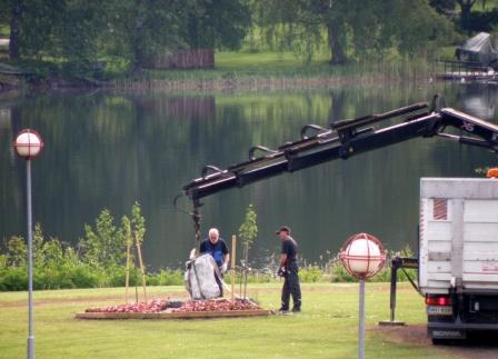Ylläolevassa kuvassa (otettu 12.6.2009 - S&J) on patsaan julkistamistilaisuuteen enää kaksi päivää aikaa. Juhani Saksa (vasemmalla) on varhain perjantaiaamuna saapunut itse tekemään muistokiven paikalleenasettelutöitä.