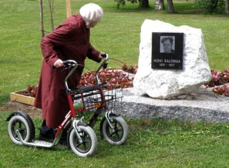 Aino Käyhty (s.1922) tutkii juuri paljastettua Hiski Salomaan muistokiveä ja sen kuvalaattaa 14.6.2009 (S&J). Aino Käyhty on Hiski Salomaan sukua.