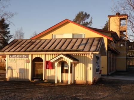 Tässä Ritva Peltolan os. Heiskasen lähettämässä (24.8.2008) kuvassa esittäytyy Kangasniemen vuonna 1949 valmistunut paloasema. Kuvan lähettäneen Ritvan isä Arvi Heiskanen aloitti uudella asemalla palopäällikkönä ja hän muutti perheineen asumaan paloaseman järvenpuoleiseen asunto-osaan vanhalta Heiskasen paikalta Hokantien varresta.