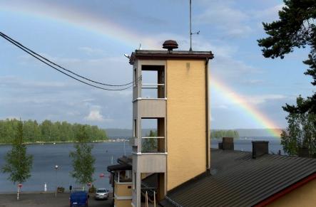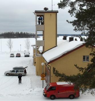 Niinkin kävi, että sähköt olivat poikki, jolloin äiti joutui kiertämään raskata käsikäyttöistä hälytintä pihalla, missä toimessa minäkin saatoin olla "avustamassa". Hälyttimellä oli jokin feminiini kutsumanimikin, jota en jaksa muistaa. Olin kaiketi aikamoinen "äkslänttäri" pienenä, koska minua usein uhattiin sillä, että joudun palotorniin huutamaan pillin sijaan.