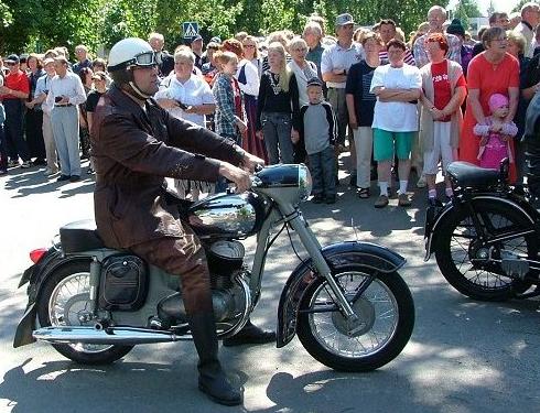Kangasniemen seurakunnan täyttäessä 350 vuotta 4. heinäkuuta 2004 järjestettiin kirkonkylän keskustassa historiallinen juhlakulkue. Vanhojen ajopelien joukossa oli tämä Petri Kohvakan luotsaama moottoripyörä, jonka merkiksi Petri kertoi (25.1.2009) Jawa CZ ja vuosimalliksi 1959 (kuvaaja: H.Hakala).