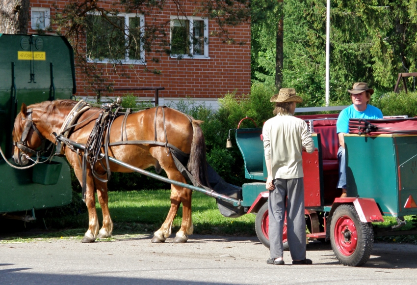 Taustan rakennus saattaisi olla kunnantalo tai joku muu julkinen. Olettamusta tukee talon seinustalla taka-alan keskellä aidan edessä osittain lumen peitossa oleva hevospuomi. Ehkä se alkoi jo tuolloin 1950 -luvun puolivälissä olla väistyvän "karvaooppeliajan" tunnusmerkki, vaikkei vielä täysin tarpeeton. Joka tapauksessa kaukana edessäpäin olivat vielä ajat, jolloin julkisien rakennusten eteen tarvittiin asiakkaille ja työntekijöille asfaltoidut pysäköintipaikat järjestyksen ja mukavuuden varmistamiseksi.