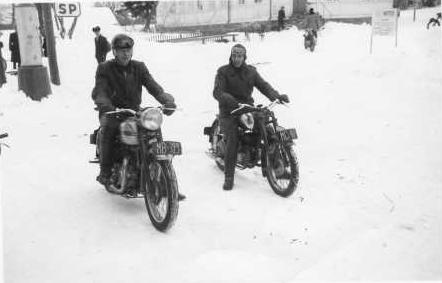 Tässä kuvassa ovat (oik.) isäni Reino Kiljunen 350-kuutoisine Jawoineen vieressään metsätyömies Olavi Manninen, Kangasniemen Moottorikerhon menestyksekkäin kilpailija 50-luvun loppupuoliskolla. Hänen pyöränsä kuvassa on 500-kuutoinen Triumph.