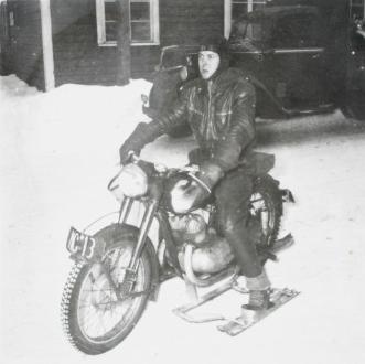 Talvella pyörässä oli sukset, jotta ajo liukkailla keleillä olisi ollut turvallisempaa. (Tällainen moottoripyörän suksivarustus nähtävissä tässä kuvaosiossa ylempänä).