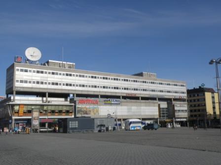 Kuopion torin itäreunalla Anttilan surullisenkuuluisa tavaratalo. Suomessakin syntyi peräti yleistä arkkitehtuurista kohua, kun tämä autolauttaa muistuttava talokolossi rakennettiin paikalla aiemmin sijainneiden poikkeuksellisen idyllisten puukaupparakennusten muodostaman taloryhmän paikalle. Kuvattu sunnuntaiaamuna 12.7.2009 (S&J).