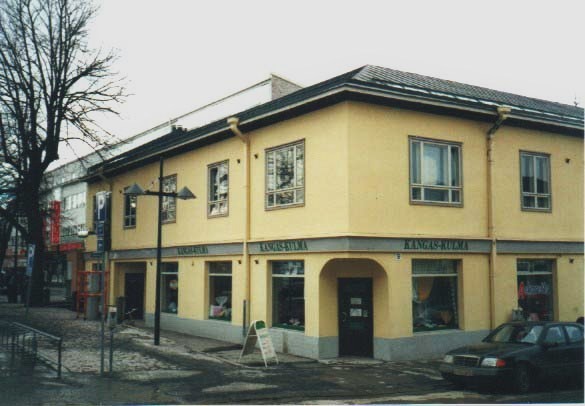 'Kangas-Kulma' Tapanaisentalossa kuvattuna v.2000 (rakennus vuodelta 1935 ~ tyylikäs funkiskauden asuin-liikerakennus). Alemmassa kuvassa näkyvä Kirkkokadun ja Koulukadun kulmaosa tuhoutui tulipalossa v. 2004.
