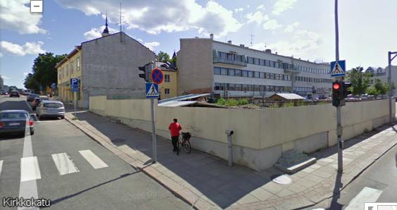 Kirkkokadun ja Koulukadun risteys - palaneen Tapanaisentalon osa matalana (GoogleMaps, 2012).