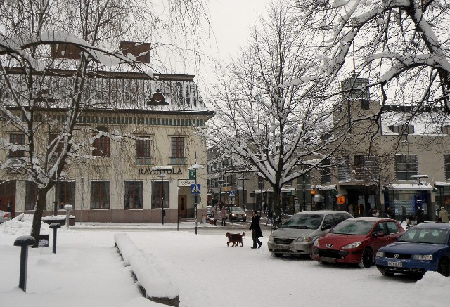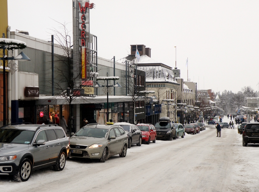 Kauppakatua kuvattu alas Karjalan kulmasta Valtakadulle (kirkko oikealla) - 21.1.2012 (S&J).