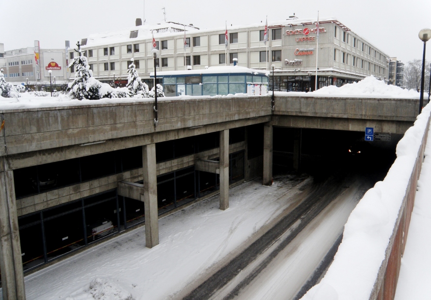 Lappeenrannan keskusta on uhrattu betoniseinämille, pysäköintihalleille ja alitusteille - siltaa, keinovaloa, pylvästä, kaidetta - jalankulkijat ovat betonielementtien keskellä irti luonnollisista mittakaavoistaan. Moottoritiemäisiä betonikuiluja varjostavat massiiviset betonihotellit ja -kauppakeskukset. Tällaiseksikö Lappeenrannan arkkitehdit kaupunkinsa ydinkeskustan todella halusivat? Kaikki tämän kuvaruudun kuvat ovat päivämäärältä 21.1.2012 (S&J). Luotaantyöntävä suuntaus itäisen pikkukaupungin keskustan rakentamiselle - kenen ehdoin?
