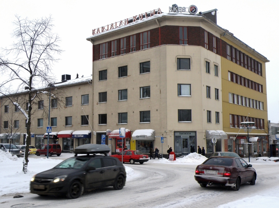 Karjalan kulma nykyisin - 21.1.2012 (S&J). Kauppakadun ja Oksasenkadun kulmaus.